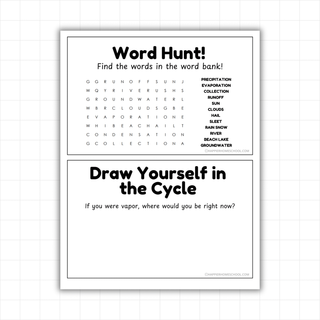 You can use this as a quick science center, a one-day homeschool lesson, or a preview before starting a full water cycle unit study.