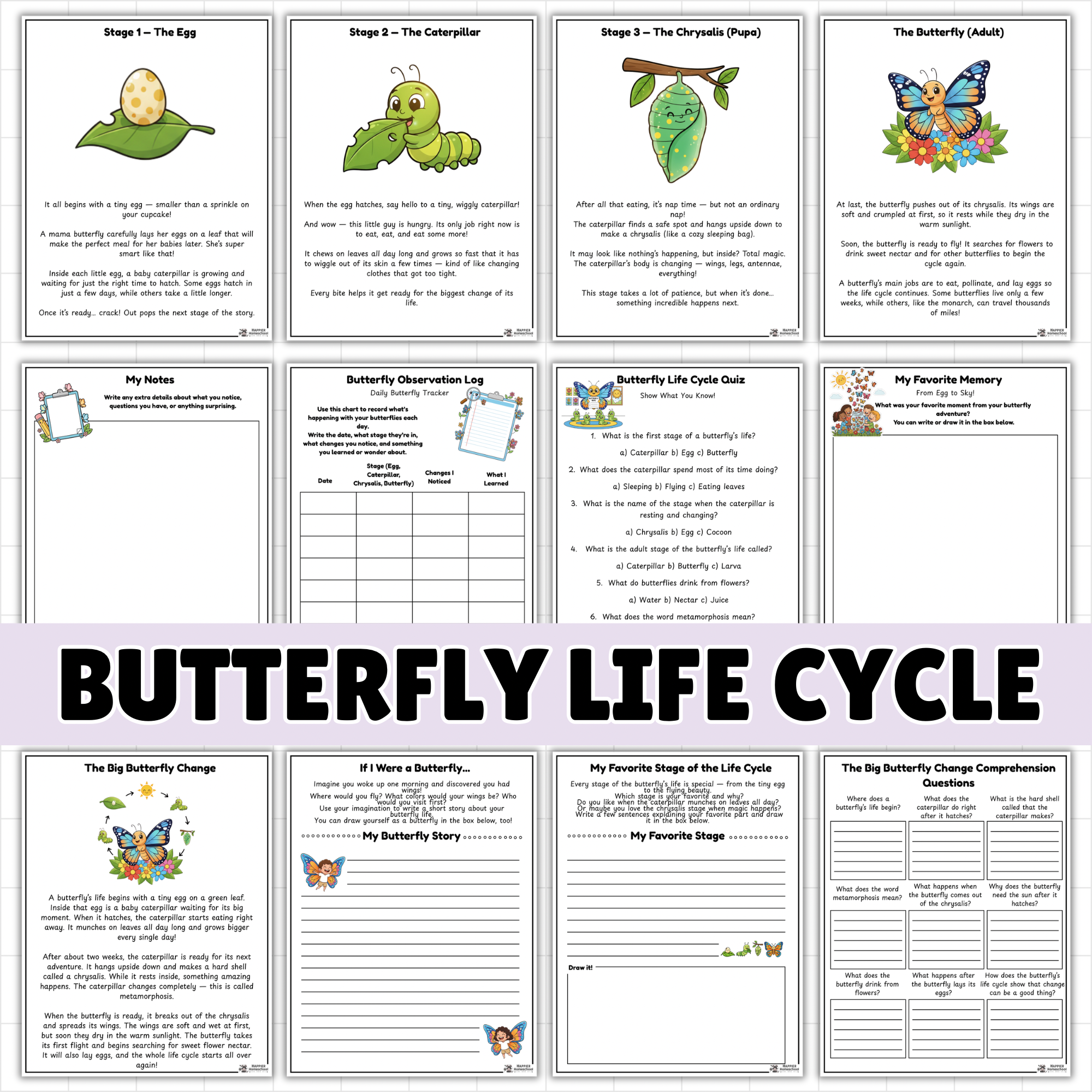Inside, kids will explore the life cycle of a butterfly for kids through four stages: egg, caterpillar, chrysalis, and butterfly. They’ll read a short passage, answer comprehension questions, define vocabulary words, complete sequencing tasks, and even track real butterflies if you’re using a grow kit.